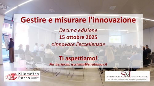 Questa settimana si è tenuta la decima edizione di "Gestire e misurare l'innovazione" presso Kilometro Rosso Innovation District, sul tema "Innovare l'eccellenza": è stato un piacere rivedere molti colleghi e conoscerne di nuovi, che speriamo di rivedere nella prossima decade!Leggi dettaglio