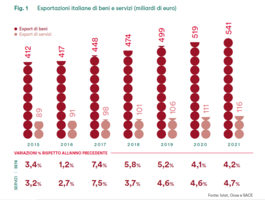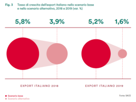 Secondo il rapporto, dopo una performance brillante nel 2017 con una crescita di 31 miliardi di euro nell’export di beni, pari al 7,4% rispetto all’anno precedente, le esportazioni italiane continueranno ad avanzare quest’anno del 5,8% e del 4,5% medio nel triennio 2019-2021.