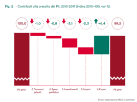 Ciò che rappresenta ancora un punto di domanda e che rappresenta una fonte d'incertezza riguarda gli effetti del protezionismo, il cambio euro/dollaro e l’evoluzione delle catene globali del valore. L’introduzione di nuovi dazi e sanzioni e le sue conseguenze potrebbero pesare sulle performance future dell’export italiano verso il resto del mondo, con un deterioramento della fiducia tra gli operatori che provocherebbe un calo nella crescita prevista per i prossimi anni.