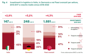 Per raggiungere tali mercati e diversificare i rischi e necessario che le dotazioni infrastrutturali riguardanti sia le reti fisiche che quelle digitali siano adeguate; l'Italia sembra ancora in ritardo rispetto ai principali concorrenti nei sistemi di trasporto delle merci ed è previsto che gli investimenti infrastrutturali italiani cresceranno ancora in futuro ma meno della media dei Paesi avanzati.