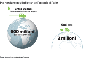 La diffusione di auto elettriche si sta sviluppando sempre più, in alcuni Paesi più che in altri. Per riuscire a contenere il riscaldamento medio del pianeta sotto i due gradi, come proposto dall'accordo di Parigi sul clima, è necessario che entro 20 anni si arrivi a 600 milioni di auto elettriche al posto di quelle a benzina e gasolio. Oggi le auto elettriche sono appena 2 milioni, lo 0,2% del totale.