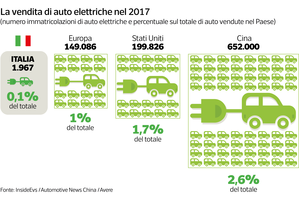 La situazione in Italia è un po' diversa: sebbene nel 2017 le vendite di auto elettriche siano aumentate, per un totale di 1.967 vetture in tutto il Paese, esse rappresentano appena lo 0,1% del mercato. Sono raddoppiate le auto ibride rispetto al 2016 — per un totale di 66 mila — ma a dominare il mercato continuano a essere le auto a benzina o diesel: secondo il focus della Associazione Nazionale Filiera Industria Automobilistica, nel 2017 ne sono state vendute poco meno di 2 milioni, con un aumento del 7,9%.